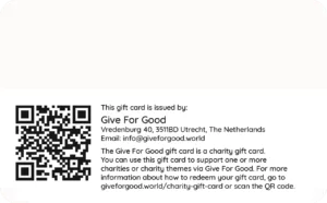 Die Geschenkkarte Give For Good ist eine Geschenkkarte für wohltätige Zwecke. Mit ihr machen Sie Ihrem Freund, Familienmitglied, Angestellten, Mitarbeiter oder Geschäftspartner ein Geschenk mit Bedeutung. Sie wählen den Betrag, der auf der Karte steht, und dann kann er oder sie den Betrag über unsere Website an eine oder mehrere Wohltätigkeitsorganisationen spenden, indem er oder sie unser spezielles Give For Good-Modell für Spenden für wohltätige Zwecke verwendet (Weitere Informationen finden Sie hier).